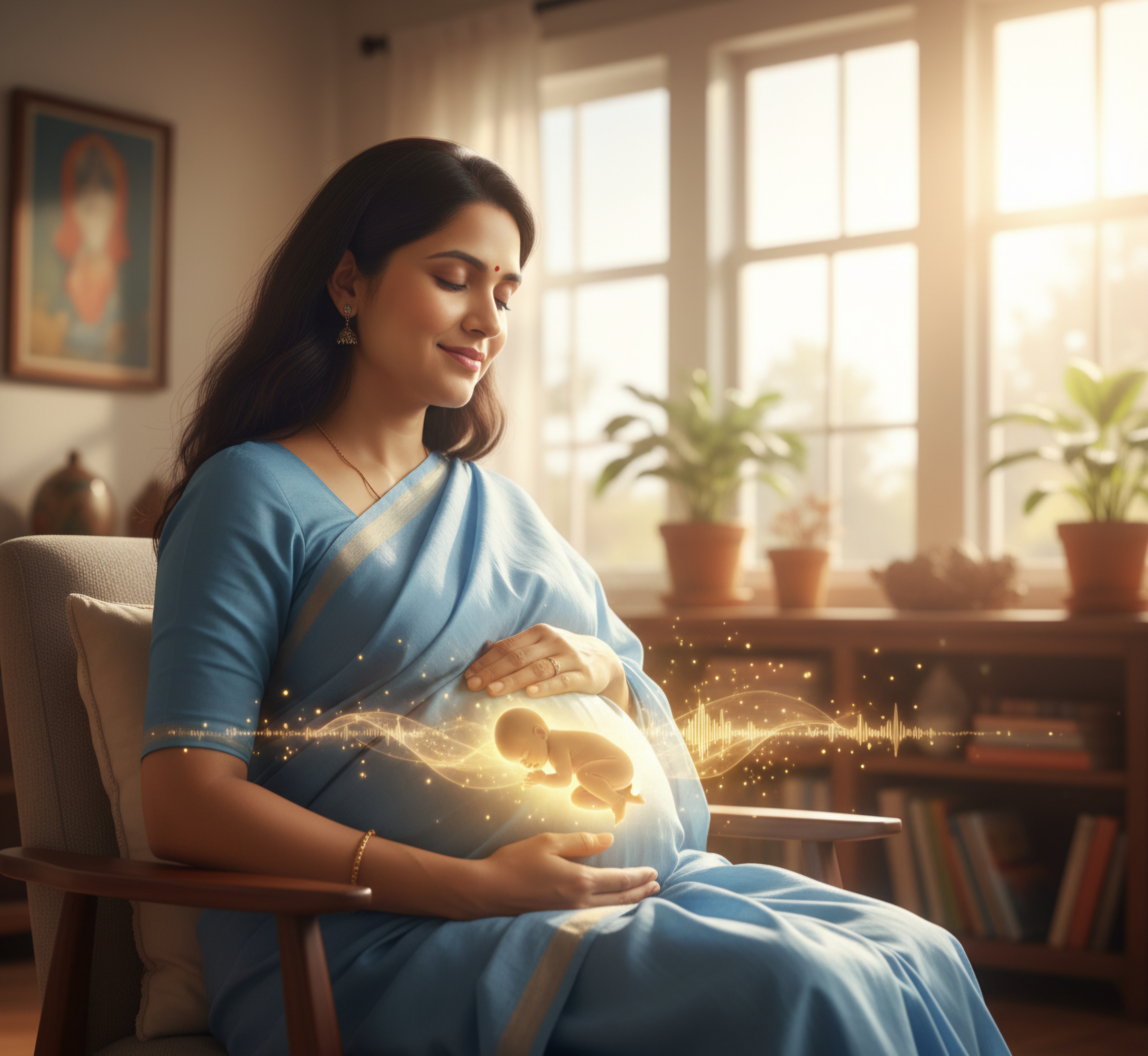 Garbhasamvaad, or “talking to the baby in the womb,” helps in developing emotional bonding between the mother and fetus. Positive affirmations, reading spiritual stories, or speaking with affection enhances fetal responsiveness. Ancient examples like Abhimanyu and Prahlad illustrate that learning begins in the womb; modern research affirms that fetuses respond to maternal voice and mood.